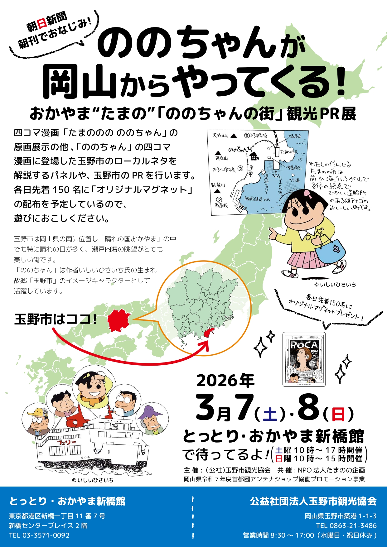 また、各日先着150名の方に「ののちゃんオリジナルマグネット」をプレゼントいたしますので、「ののちゃん」ファンの方のご来場お待ちしています。(アンケートへのご協力についてもお願いいたします。)
